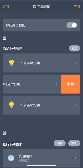 執行結果:可能會失敗,因為系統檢查此時三個條件並沒有同時滿足。若三個接待區的燈當前都是關閉狀態,用戶逐一打開就是觸發了三個事件的條件,事件在系統裡是排著隊一個一個檢查的,沒有辦法在同一時間點檢查多個不同的事件是否滿足一個條件,所以就不會觸發自動化執行。