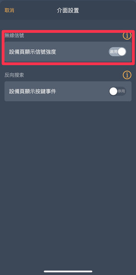 「訊號強度」可以至「我的——介面設置——無線訊號」啟動,讓訊號強度在設備頁面顯示